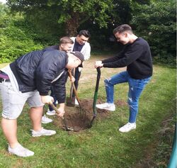Mehrere Schüler*innen des Leibniz-Gymnasiums zwischen 10 und 18 Jahren kümmerten sich eine Woche vor den Sommerferien um das Wohlbefinden der Bienen. Die engagierten Jugendlichen gruben Löcher, pflanzten Bäume und versorgten den neuen Lebensraum mit frischem Wasser.