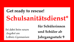 Im Schulsanitätsdienst übernehmen gut ausgebildete Schulsanitäterinnen und Schulsanitäter die Erstversorgung von verletzten oder akut erkrankten Personen im Schulalltag. Sie entscheiden auch darüber, ob der Rettungsdienst alarmiert wird. Sei dabei und werde Sanitäter am Leibniz!