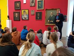 Die Museumspädagogin Frau König führte die Schülergruppe durch das Haus. Im Ausstellungsgespräch wurden berühmte Portraits erklärt. Anschließend wurden mit einem Trick Selbstportraits mit Aquarellkreiden gemalt.
