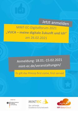 Die Anmeldephase für das diesjähriges MINT-EC-Digitalforum ist heute Morgen gestartet. Unter dem folgenden Link können sich unsere Lehrkräfte und Schüler*innen sich bis zum 15.02.21 anmelden.