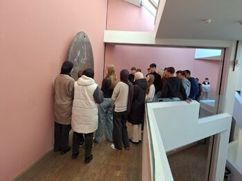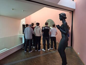 Frau Ella Katharina König, die Leiterin der Museumspädagogik des Kunstmuseums führte uns durch die neue Ausstellung. Diese zeigte sich ganz begeistert, dass die Schüler*innen ihrerseits mit Enthusiasmus dabei waren und freut sich schon über die kreativen und spannenden Ergebnisse.