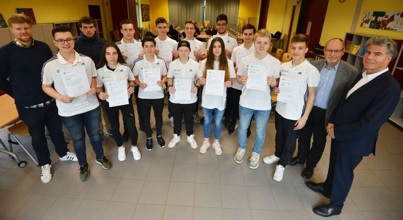 Auch am Leibniz-Gymnasium war man sehr zufrieden mit dem Ablauf der Ausbildung. „Die Schülerinnen und Schüler haben das super gemacht. Man hat gemerkt, dass sie richtig Spaß daran haben und es ist schön zu sehen, dass es junge Leute gibt, die sich weiterbilden wollen und dafür auch ihre Freizeit opfern“, so Jörn Heitbreder, Sportlehrer am Leibniz-Gymnasium, der die Verbindung zum DFB herstellte . Auch bei der offiziellen Zertifikatsübergabe wurde die Wichtigkeit solcher Veranstaltungen noch einmal deutlich. Der Schulleiter Konrad Fulst und Klaus Balster (Ehrenamtler des DFB, re.) waren sich einig, dass die Bereitschaft Verantwortung für sich selbst und insbesondere für andere zu übernehmen, keine Selbstverständlichkeit ist.