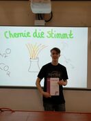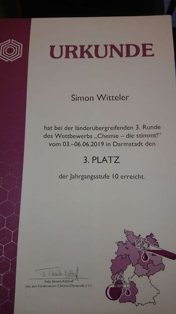 Simon Witteler hat das Bundesfinale beim Wettbewerb "Chemie die stimmt!" erreicht. Unter mittlerweile nur noch 50 Teilnehmern setzte er sich am 06.06. im Landesfinale durch. Wir gratulieren für diese herausragende Leistung!