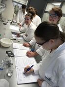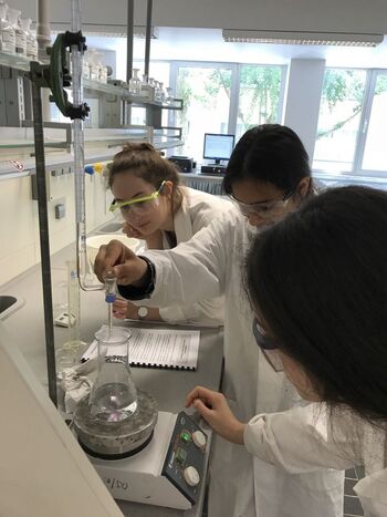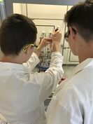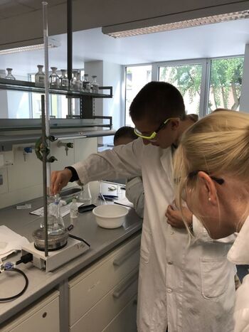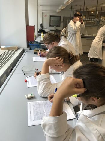 Nach dem ausführlichen Seminar zur Vorbereitung des Experimentes, welches ungefähr eine Stunde ging, sind wir alle runter Richtung Labor gegangen und haben uns davor einen Kittel angezogen und eine Schutzbrille mitgenommen. Mädchen mit langen Haaren mussten, wie üblich beim Experimentieren die Haare zurückstecken.