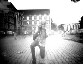 Härtetest für den Autor beim Schulfest: 15 Sekunden Stillhalten für ein Schwarz-Weiß Foto aus dem Schuhkarton, so lang ist etwa die Belichtungszeit, und dann die Überraschung, als die beiden Schüler nach ein paar Minuten mit dem entwickelten Fotopapier zurück kommen: Ach ja, natürlich, das ist erstmal ein Negativ! Einscannen, umkehren, fertig ist das Positiv, und wir sehen: zumindest die Schule hat sich nicht bewegt in der Zeit!