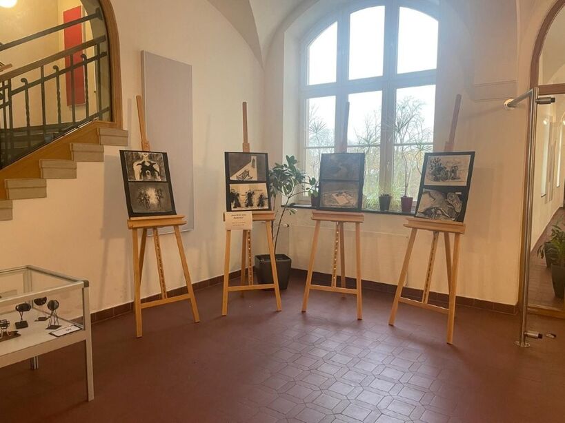 Dieses Projekt betreuten die Kunstlehrerinnen Kerstin Petershöfer und Sandra Pruß mit ihren insgesamt drei Q2-Kunstkursen mit 77 Schüler*innen. Eine Ausstellung und Präsentation der Halbjahresergebnisse im Foyer der Aula begleitete das Theaterevent. Es wurden neben illustrierenden Kreidezeichnungen auch Stop-Motion-Filme gezeigt, welche sich mit der Illustration von Kafkatexten beschäftigten. Vorbild für die Arbeiten war die Kunst des südafrikanischen Künstlers William Kentridge, dessen Werke zu Ausgrenzung und Apartheid teilweise auf Kafkatexte rekurrieren und Fragen zu Identität, Anpassung, Ausgrenzung, Metamorphose und Entfremdung aufwerfen. Kafkas von Markus Kiefer interpretierter Bericht über die Menschwerdung des Affen Rotpeter ist die Geschichte einer erzwungenen Assimilation, welche auch als pädagogische Satire verstanden werden kann.